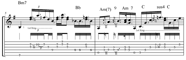 In Takt 5 ist erneut Barré Power angesagt. Lege also zunächst den Zeigefinger im 7.Bd. über alle Saite und spiele den Grundton des geforderten Bm7 auf der E-Saite an. Den Triller auf der "2" erledigst du dann mit dem kleinen Finger. Das nachfolgende "D" (Zählzeit "2+") hast du ja bereits mit dem Barré abgedeckt. Fehlt noch das "B" im 9.Bd. der D-Saite. Das greifst du, genau wie bei einem normalen B-Moll Barré auch, am besten mit dem dritten Finger. Kommen wir zu den beiden "Doppel-Whooper" auf den hohen Saiten - da du ja ohnehin nach wie vor einen Barrégriff im 7.Bund greifst sollten die beiden Double-Stops kein großes Problem für dich darstellen. Bleibt uns noch der Bb-Dur Akkord auf der "3" des Takts. Hier gilt die Devise: Einfach den Dreiklang greifen und loslegen! Im sechsten Takt wird es dann noch einmal spannend. Nach dem stressfreien Einstieg mit der leeren A-Saite drückst du die D-, und G-Saite im 5ten Bund zeitgleich mit dem Zeigefinger ab, (Barré) schlägst beide Saiten an (Vorschlagnote) und hämmerst mit dem zweiten Finger auf den 7.Bund der D-Saite - lass die beiden Saiten danach aber auf jeden Fall gegriffen. Anschließend schlägst du beide "Drähte" erneut an (Vorschlagnote) und hämmerst mit dem 4.Finger auf den 9.Bd. der D-Saite. Danach geht das Ganze im Rückwärtsgang weiter. Nimm den 4.Finger wieder runter und spiele die D-, und G-Saite zeitgleich im 7., und 5. Bund an. Jetzt nimmst du den 2.Finger weg und landest so wieder am Ausgangspunkt der Aktion - dem kleinen Barré im 5.Bund (D-und G-Saite). Etwas Entspannung verschafft dir die geforderte leere A-Saite, bevor es auf der "3" noch mal richtig zur Sache geht. Greife das "C" (3.Bd. A-Saite) mit dem Zeigefinger und die nachfolgenden "Fünfer" mit dem Ringfinger (oder kleinen Finger) im Barré-Stil. Aber Achtung: Die doppelte Vorschlagnote muss mit dem Zeigefinger gegriffen werden. Du musst also versuchen so schnell wie möglich zwischen den beiden Barrés zu wechseln. Das nachfolgende Hammering (6.Bd. B-Saite) erledigst du mit dem 2.Finger -für die anschließenden "Fünfer" kommt der Zeigefinger im Barré-Stil zum Einsatz.