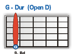 TIPP: Alle in ihrer Stimmung veränderten Saiten, werden Heruntergetuned. Die beiden E-Saiten um einen Ganzton (auf D), die G-Saite um einen Halbton auf F# und die B-String um einen Ganzton auf A. Beim Anschlagen der Leer-Saiten einer Gitarre die mit einer offen D Stimmung ausgestattet ist, erklingt ein lupenreiner D-Dur Akkord. Aus dieser Tatsache ergibt sich, dass auch ein purer Barre´Griff ab sofort im reinsten Dur erklingt. Für unser Vorhaben am Ende des Workshops einen authentischen Slide Blues realisieren zu können, ist das natürlich sehr angenehm. Schließlich brauchen wir jetzt nichts weiter zu tun, als die Saiten an den entsprechenden Stellen komplett mit einem "breiten" Finger (oder dem Slide-Röhrchen) abzudrücken. Wo genau, zeigt dir die folgende Abbildung: