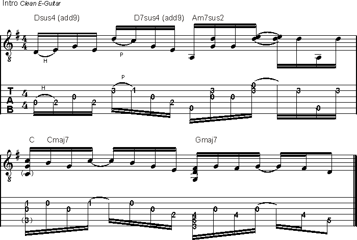Damit das Ganze etwas alltagstauglicher wird und natürlich auch um der Tatsache Rechnung zu tragen, dass du mit Sicherheit keine Bariton-Klampfe zur Hand hast, habe ich unsere Version des Song-Intros im Standardtuning notiert und mit einer normalen 6-saitigen Axt eingespielt. So ersparst du dir lästige Umstimmversuche und kannst sofort loslegen. Weiter Infos zu Mikes Tuning, findest du auf den nächsten Seiten. Zurück zum Song! Die Basisakkordfolge des Intro-Teils ist eigentlich recht simpel. Die Tonart ist G-Dur und auch mit Standardchords gespielt, macht die Progression schon einen ziemlich guten Eindruck.