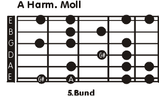 Aber das war noch nicht alles. Auch der eingeschobene E7 auf der "3" des zweiten Takts ist ein echter Sonderling. Als reinrassige Dominate ist es die Aufgabe des Akkords sich in das nachfolgende "Am" aufzulösen. Deshalb auch die Bezeichnung V7/Am oder V7/II.m7. Und genau aus diesem Grund würde man für die Improvisation über diesem Akkord auch die A Harmonische Moll-Tonleiter wählen, auf deren V.Stufe sich mit " E HM5" bzw. Harmonic Dominant eine Skala befindet, die in diesem Zusammenhang einen perfekten Job abliefern kann.