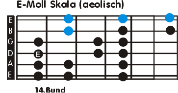 Jetzt habe ich zwei Möglichkeiten. Entweder ich suche mir die vorher theoretisch gefundenen tonleitereigenen Terzen wahllos auf dem Griffbrett zusammen(zum Beispiel auf der E-Saite im 3. 5 und 7.Bund), oder ich bemühe mich eines praktischen kleinen Trix. Und der sieht wie folgt aus: Zunächst suche ich mir die Position der E-Moll Skalen heraus in der die harmonisierenden Terzen (G,F#,A) auf der selben Saite liegen, wie die Grundmelodie: Hier also die B-Saite. Dabei muss der erste Ton der 2.Stimme am "linken Rand" der Skala angeordnet sein.