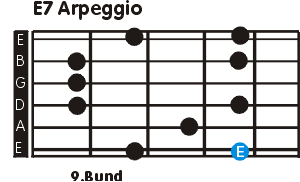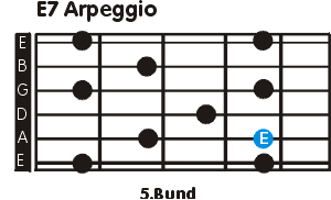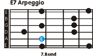 Zweiter Bestandteil des Licks: Auszüge aus diversen E7 Arpeggien. Dabei kommen folgende Fingersätze zum Einsatz: