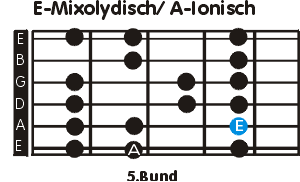Und, zuviel versprochen? Der Lick basiert auf der E mixolydischen Tonleiter, die, eingefleischte Skalenkenner werden es wissen, ein angestammtes Mitglied der A-Dur Scale (A-Ionisch )ist. Hier findet man sie auf der V.Stufe.