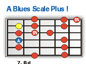 Die Töne, die paarweise zusammengehören, haben wir durch jeweils gleiche Farben kenntlich gemacht. Die Noten C, D und A sind standardmäßig in der A-Blues-Scale enthalten. Die Töne C#, A# und B bezeichnet man in diesem Zusammenhang als chromatische Durchgangstöne. Den Abschluss des Takts verziere ich mit dem Einsatz der großen Terz des A7 Akkordes (C#, 6. Bd/G-Saite). Die anschließend folgende Blue Note (Eb, 6. Bd/A-Saite) leitet sicher zum D, dem solide klingenden Grundton des D7 Chords der Takte fünf und sechs weiter. Aber das ist noch nicht alles: Den zweiten Takt des "D-Parts" gestalte ich mit einer Linie, die ganz massiv auf die positive Wirkung des Sounds des F#, der großen Terz des D7 Chords, baut. Hier die verwendeten Skalen im Überblick: