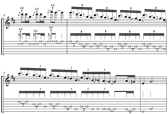 Ein Beispiel: die ersten beiden Quintolen-Gruppen spielst du "normal" mit "spitzen Fingern". Interessant wird es auf der letzen Quintole der "2" (14.Bd, D-Saite). Auch diesen Ton spielst du zunächst mit der Kuppe des dritten Fingers, wanderst dann allerdings nicht mit dem kompletten Finger zurück auf die B-Saite (14.Bd., das würde zu lange dauern), sondern klappst den Finger, ausgehend von der D-String, im Barre´-Stil nach unten. So erwischt du die Note (C#, 14.Bd. B-Saite) mit der "Breitseite" des Fingers. Das geht entschieden schneller und ist der einzige Weg das Pattern im geforderten Tempo hin zu kriegen. Einzig das anschließende Pull Off mit dem Barre-Finger auf den 12ten Bund der B-Saite, könnte etwas problematisch werden. Aber das kennst du ja schon von unserem Double-Stop Lick. Genauso verfährst du übrigens auch mit dem "14ten Bund der G-Saite" ( 3+). Auch diesen Ton drückst du mit dem Barre´Finger ab. Pauschal gilt dieser Technik-Tipp für alle Passagen des Quintolen-Lauf, in denen auf verschiedenen Saiten Töne im "14ten Bund" gefordert sind. Dementsprechend ist die beschriebene Technik auch im kompletten Takt 8 angesagt.